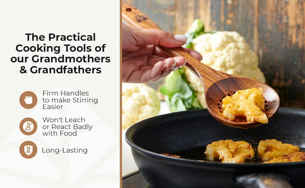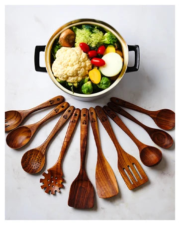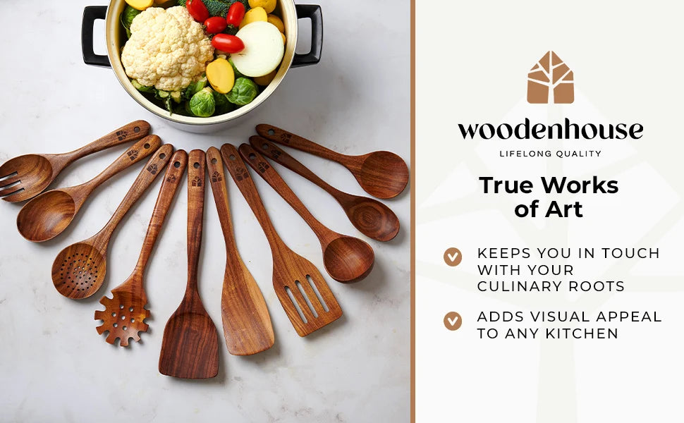 🍴 Tresett for kjøkken – 10 deler i slitesterkt teak Oppgrader kjøkkenet ditt med et komplett sett miljøvennlige kjøkkenredskaper i tre. Dette eksklusive settet består av 10 deler i naturlig teak-tre – perfekt for deg som vil ha både funksjon og design,